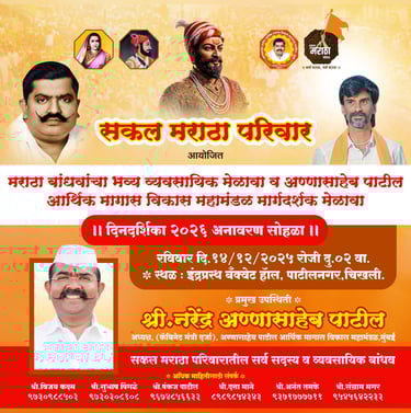सकल मराठा परिवार, पुणे जिल्हा तर्फे दिनांक १४ डिसेंबर २०२५ रोजी आयोजित पुणे जिल्ह्यातील मराठा बांधवांचा भव्य व्यवसायिक मेळावा व अण्णासाहेब पाटील आर्थिक विकास महामंडळ मार्गदर्शन मेळावा, तसेच सकल मराठा परिवार दिनदर्शिका २०२६ अनावरण सोहळा हा कार्यक्रम अतिशय उत्साहात आणि सुरळीतपणे पार पडला.