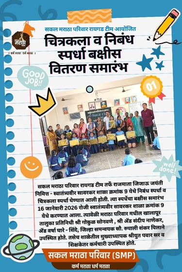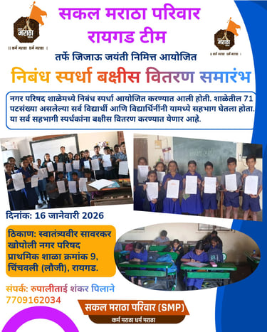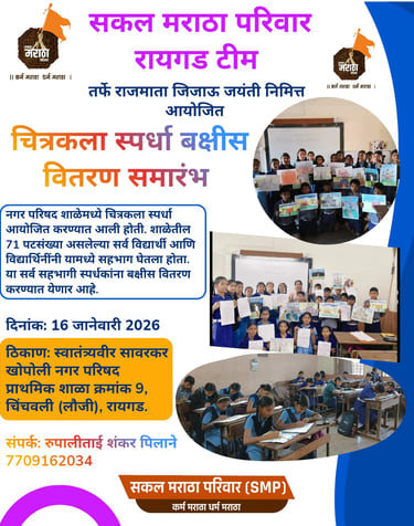 राजमाता जिजाऊ जयंतीचे औचित्य साधून सकल मराठा परिवार (SMP) रायगड टीम तर्फे स्वातंत्र्यवीर सावरकर नगरपालिका प्राथमिक शाळा क्र. ९, चिंचवली (लौजी), रायगड येथे विद्यार्थ्यांसाठी निबंध स्पर्धा व चित्रकला स्पर्धा आयोजित करण्यात आली. या उपक्रमाचे बक्षीस वितरण समारंभ १६ जानेवारी २०२६ रोजी उत्साहात आणि प्रेरणादायी वातावरणात पार पडले.