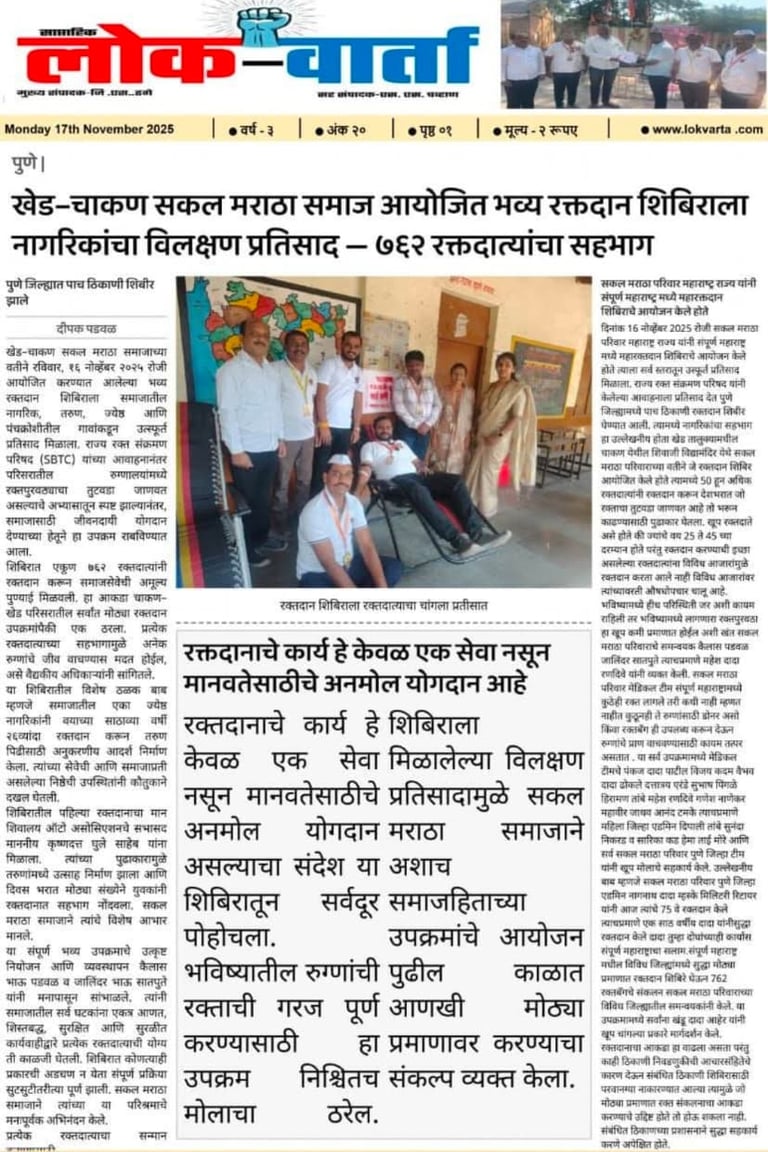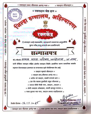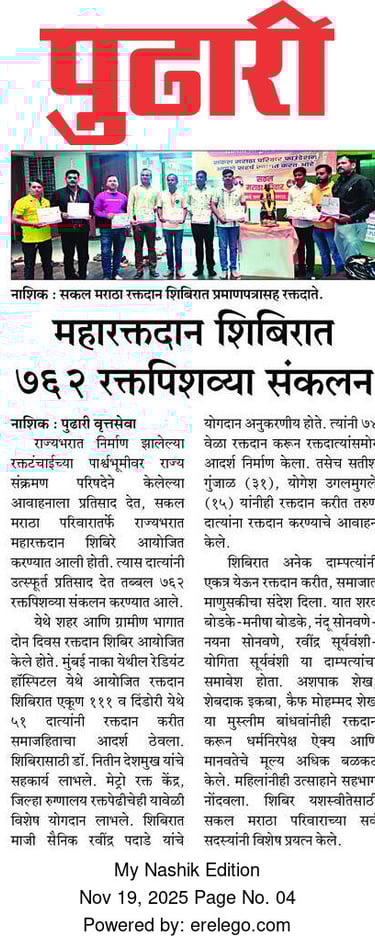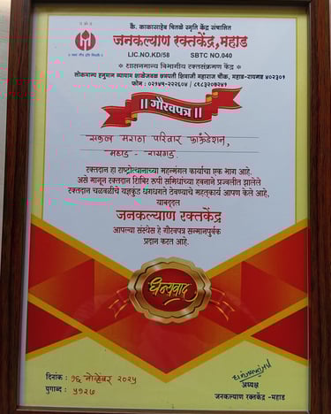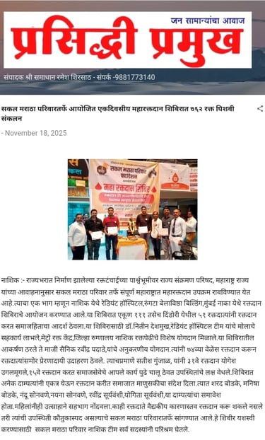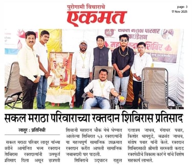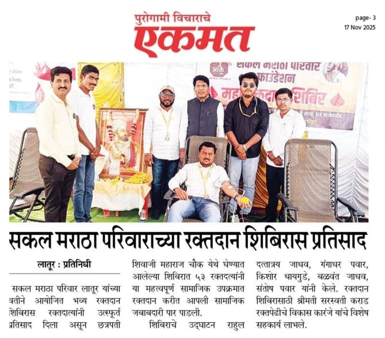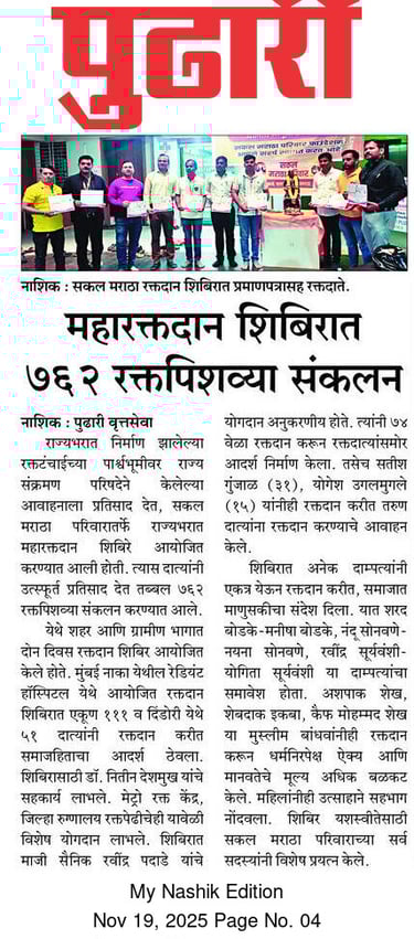 सकल मराठा परिवार (SMP) तर्फे आयोजित “महारक्तदान शिबिर २०२५” या भव्य उपक्रमाचा समारोप अत्यंत उत्साहात पार पडला. राज्यातील विविध जिल्ह्यांत एकाच दिवशी घेतलेल्या रक्तदान शिबिरांतून एकूण ७५२ रक्त पिशव्यांचे संकलन करण्यात आले. समाजातील तरुण, महिला, ज्येष्ठ नागरिक यांनी मोठ्या संख्येने सहभाग नोंदवून “रक्तदान हेच जीवनदान” हा संदेश प्रत्यक्ष कृतीतून दिला.
