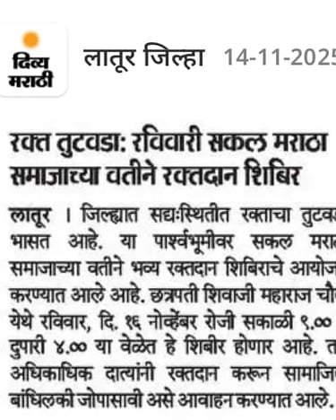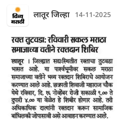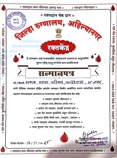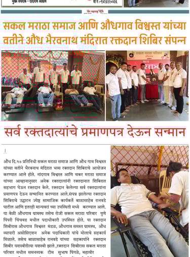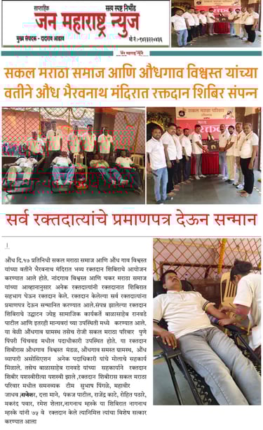 नगरमध्ये सकल मराठा परिवारतर्फे महारक्तदान उपक्रमांतर्गत रक्तदान शिबिराचे आयोजनसंपूर्ण उपक्रमाचा आढावा घेणारी बातमी: